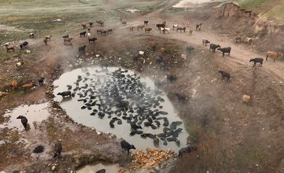 Dronla kaydedilen görüntülerde, kaplıcada yoğun şekilde bulunan mandalar ve çevredeki diğer büyükbaş hayvanlar adeta Afrika savanlarını andıran bir manzara oluşturuyor.