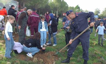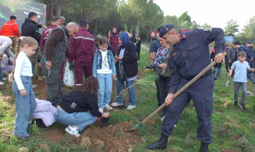 Öğrenciler anne ve babalarıyla birlikte fidan dikerken, törene katılan davetliler ve jandarma komutanları da etkinlikte yer aldı.