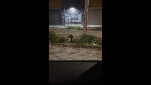 Nilüfer Üçevler'de gece yarısına yakın saatlerde tilkinin ağzında kediyle sokakta koştuğu anlar cep telefonuyla kaydedildi.