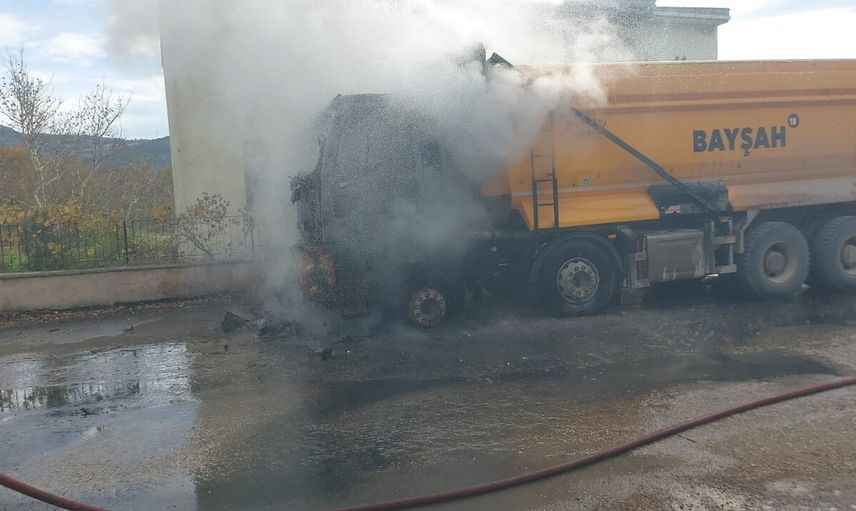 Bursa'nın Mustafakemalpaşa ilçesi Devecikonak Mahallesi'nde hareket halindeki bir hafriyat kamyonu, Taş Mektep yakınlarında dumanlar çıkmasıyla sürücünün fark etmesi üzerine olay yerine döndü. Sürücü araçtan inerek canını kurtardı.
