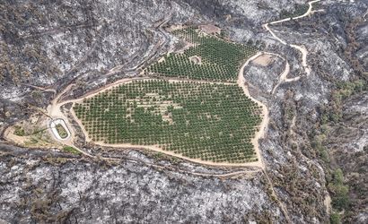 Bursa'nın Gürsu ve Kestel ilçeleri arasında çıkan yangında, çevresindeki orman küle dönen 48 dönümlük nektarin bahçesi, adeta gri renge dönen bölgede yeşilliğiyle dikkati çekiyor.
