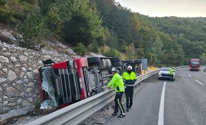 Ahmet S. yönetimindeki 42 ERG 17 plakalı hayvan yemi yüklü tır, Güney Kestane mevkisinde devrildi.