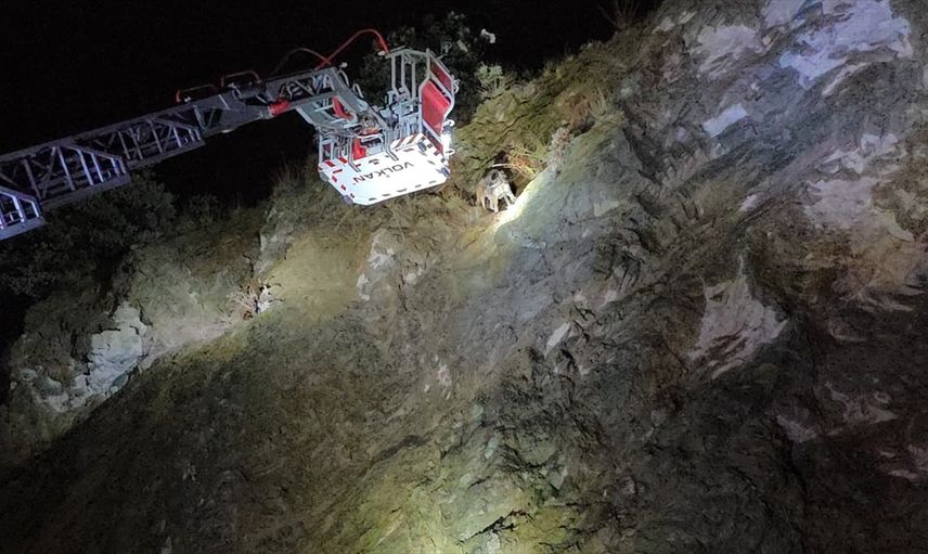 Olay yerine gelen itfaiye ekipleri, aracın merdiveniyle güvenli şekilde yaklaşamayınca halatla yamaç inişi yaparak kurtarma gerçekleştirdi. Köpek, kayalıkta yaklaşık 20 metre yükseklikte mahsur kalmıştı.