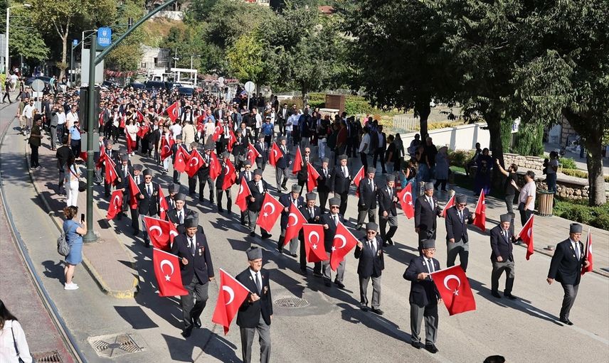 Bursa'nın düşman işgalinden kurtuluşunun 103. yıl dönümü dolayısıyla düzenlenen tören, protokol üyeleri, gaziler ve vatandaşların ellerinde Türk bayrakları ile Tophane’den Heykel Semti’ndeki Atatürk Anıtı’na yürüyüşüyle başladı.