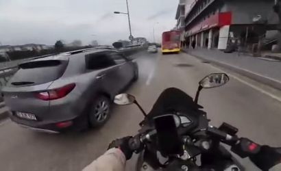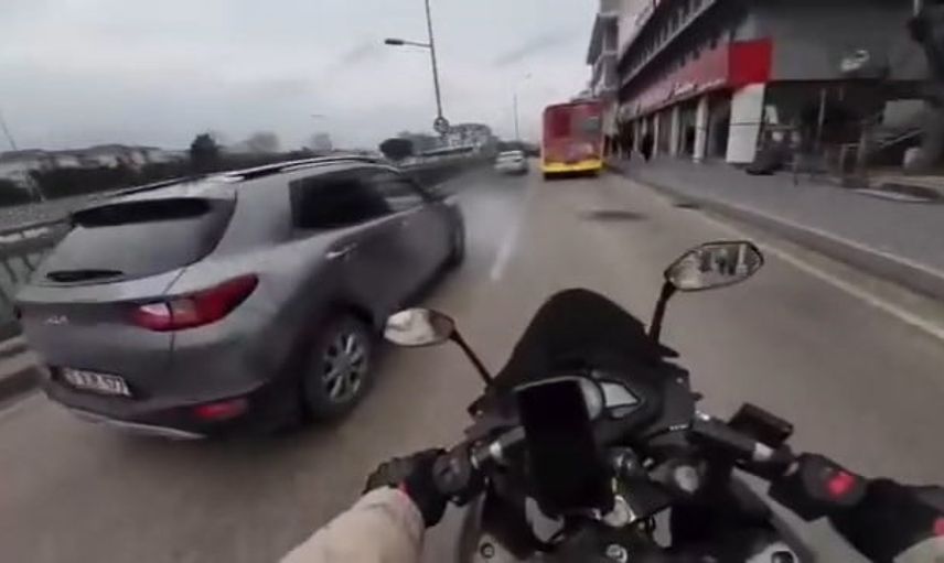 Görüntülerde, bir anda hızlanan motosikletlinin yolda ilerleyen bir otobüse çarpmamak için solundan giden otomobilin önüne geçtiği görülüyor. Bu manevra sırasında sürücü direksiyon hakimiyetini kaybediyor.