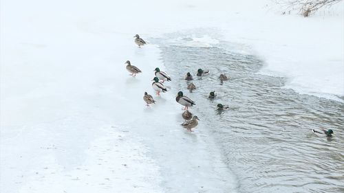 Kars Çayı'nda buzlar arasında yiyecek arayan yeşilbaş ördekler, dondurucu soğukların ardından dikkat çekti.