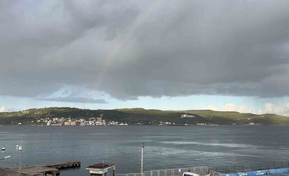 Çanakkale’de dün öğle ve gece saatlerinde aralıklarla devam eden yağmur, gündüz kısa süreliğine açık havaya bırakınca boğazda renkli bir manzara oluştu.