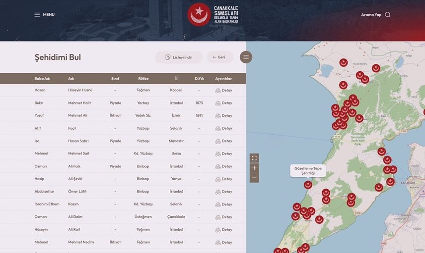 Kültür ve Turizm Bakanlığı Çanakkale Savaşları Gelibolu Tarihi Alan Başkanlığınca hazırlanan "Şehit Bilgi Kapısı Projesi" ile Çanakkale Savaşlarında şehit olan askerlerin savaştıkları cepheler, görev yaptıkları birlik ve kahramanlık hikayeleri gibi detaylı bilgilere kurulacak internet sitesinden erişilebilecek. Çanakkale Savaşları Gelibolu Tarihi Alan Başkanı İsmail Kaşdemir, proje hakkında bilgi verdi.
