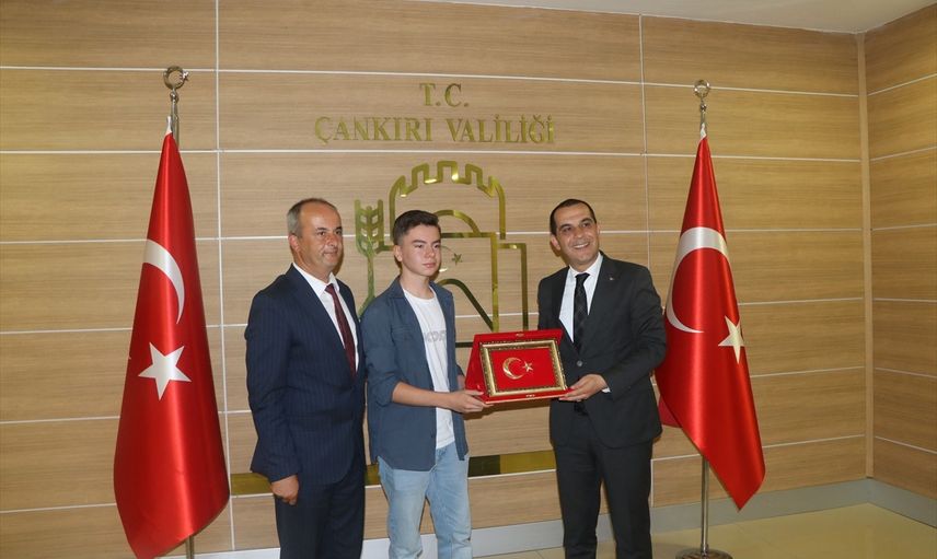 Çankırı'da rüzgarda ters dönen Türk bayraklarını düzelten Mert Can Ballıca (16), Çankırı Valisi Mustafa Fırat Taşolar (ortada) tarafından makamında ağırlandı.