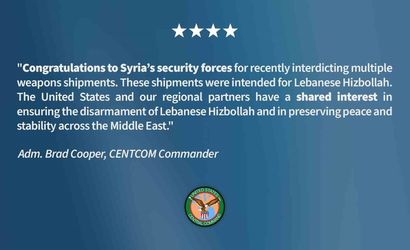 Amiral Cooper'ın açıklaması: "Suriye güvenlik güçlerini, son dönemde birden fazla silah sevkiyatını engelledikleri için tebrik ediyoruz. Bu sevkiyatlar Hizbullah’a ulaşacaktı. ABD ve bölgedeki ortaklarımız, Hizbullah’ın silahsızlandırılmasını sağlama ve Orta Doğu genelinde barışı ve istikrarı koruma konusunda ortak bir çıkara sahiptir"