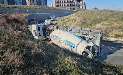 Devrilmenin etkisiyle araçtaki betonun bir bölümü çevreye saçıldı; bazı kısımlar yola döküldü.