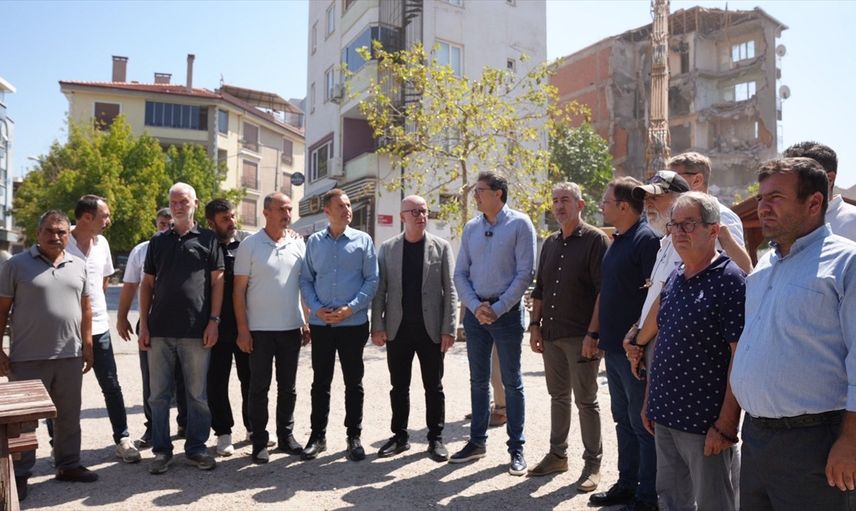 CHP Genel Başkan Yardımcısı Ensar Aytekin (sağ), Balıkesir'in Sındırgı ilçesinde 10 Ağustos’ta meydana gelen 6,1 büyüklüğündeki depremden etkilenen vatandaşları ziyaret etti.