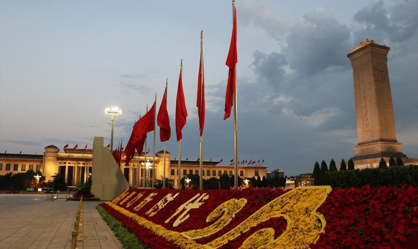 Meydanda, ülkenin kurucu lideri Mao Zıdong'un portresinin bulunduğu, 'Yasak Şehir' olarak bilinen eski İmparatorluk Sarayı'nın kemerli güney duvarı aydınlatılırken, meydanın ortasına Ulusal Gün için dev bir çiçek buketi yerleştirildi.