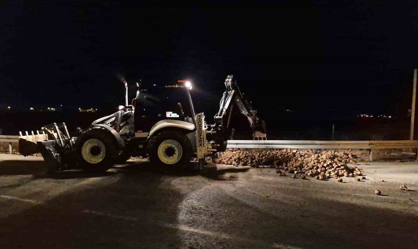 Yola saçılan şeker pancarları nedeniyle Yozgat istikameti yaklaşık 2 saat ulaşıma kapandı. Alaca Belediyesi ekipleri tarafından yapılan temizlik çalışmasının ardından yol tekrar trafiğe açıldı.