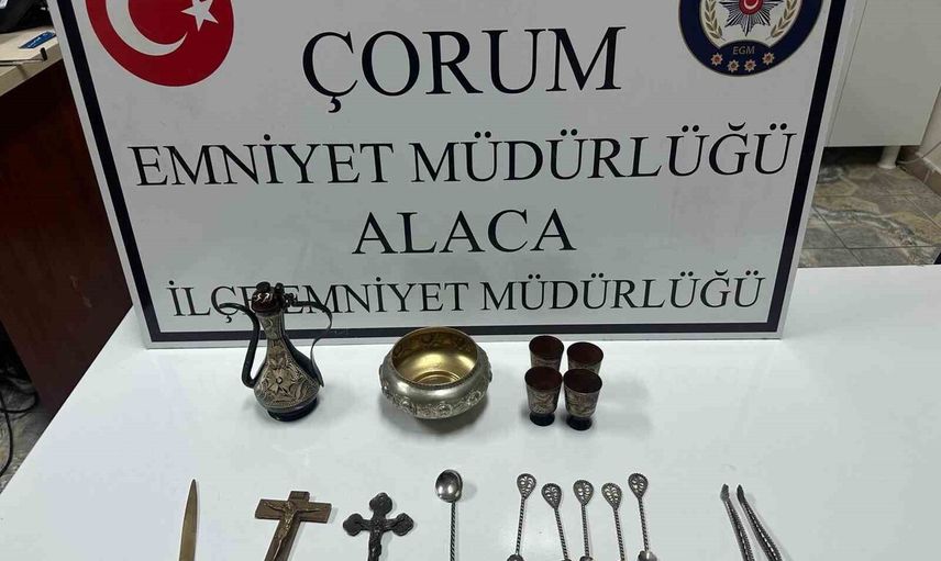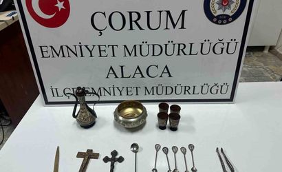 Çorum’un Alaca ilçesinde polis ekipleri tarafından düzenlenen operasyonda, tarihi eser niteliği taşıdığı değerlendirilen 2 adet haç ile çeşitli dönemlere ait malzemeler ele geçirildi.