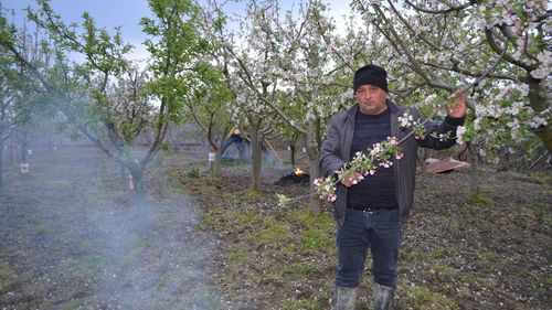 Çorumlu çiftçiler, zirai don tehlikesine karşı meyve ağaçlarını korumak için ateş yakarak tedbir alıyor.