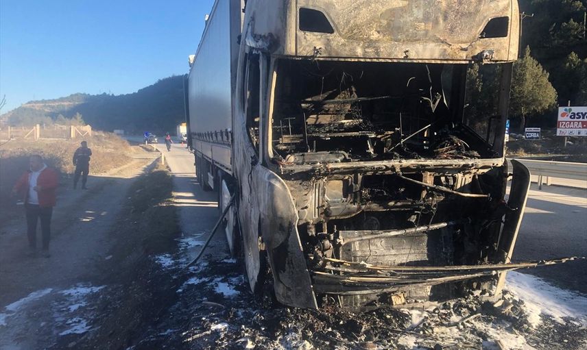Tırı yol kenarına park eden sürücü, yangını kendi imkanlarıyla söndürmeye çalıştı. Ancak başarılı olamayınca 112 Acil Çağrı Merkezi'nden yardım talebinde bulundu. İhbar üzerine, olay yerine polis ve itfaiye ekipleri sevk edildi.
