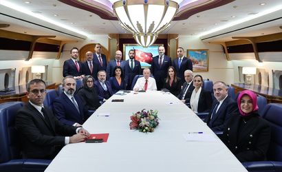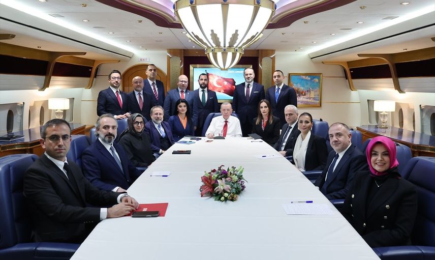 Cumhurbaşkanı Recep Tayyip Erdoğan, Malezya, Endonezya ve Pakistan ziyaretleri dönüşü uçakta gündeme ilişkin değerlendirmelerde bulundu, gazetecilerin sorularını yanıtladı. Uçakta, Anadolu Ajansı (AA) Yönetim Kurulu Başkanı ve Genel Müdürü Serdar Karagöz (ayakta solda) de yer aldı.