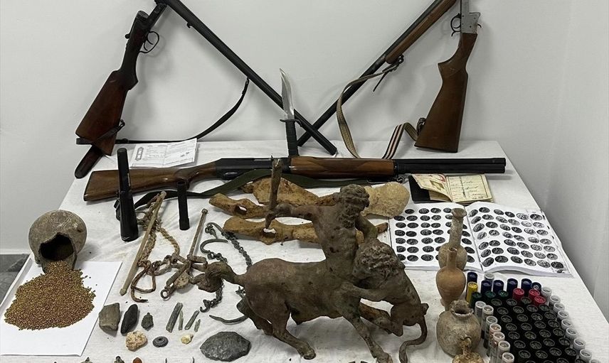 Yapılan operasyonda, şüphelilerin evlerinde gerçekleştirilen aramalarda birçok tarihi eser ele geçirildi. Bu eserler arasında Bizans dönemine ait bir testi, 4 sikke, 6 tarım aleti, 2 terazi, Tunç Çağı'na ait 2 testi, Roma dönemine ait bir gözyaşı şişesi, 8 süs eşyası, 3 kandil, dedektör, 3 av tüfeği ve 70 av tüfeği fişeği yer aldı.