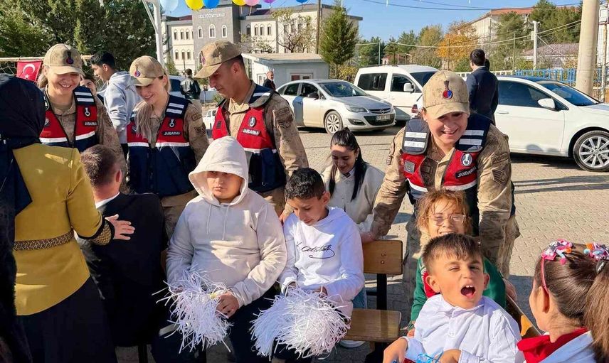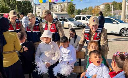 Etkinlikte ayrıca Türk bayrakları dağıtılarak bayrak sevgisi vurgulandı; jandarma personeli öğrencilerle birlikte halay çekerek onların mutluluğuna ortak oldu.