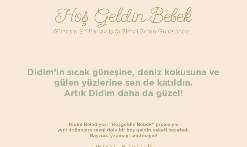 Projeyle ilgili değerlendirme yapan Didim Belediye Başkanı Hatice Gençay, şunları söyledi: "Didim’de doğan her bebekle birlikte umutlarımız tazeleniyor, kentimizin neşesi artıyor. Yeni hayatların ilk adımlarına tanıklık etmekten büyük mutluluk duyuyoruz. Ailelerimizin yanında olmak ve bebeklerimize sevgi dolu hediyelerimizle ‘hoş geldin’ demek bizim için çok kıymetli"