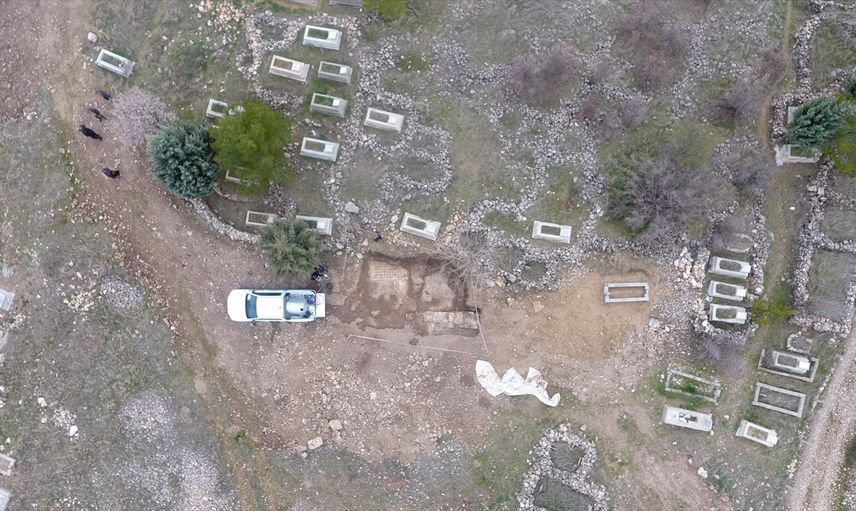 Diyarbakır'ın Ergani ilçesinde mezar kazısı sırasında bulunan mozaikte yürütülen incelemede, içerisinde haç motifi bulunan "Davut Yıldızı" sembolü ve Grekçe yazı tespit edildi.