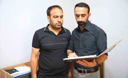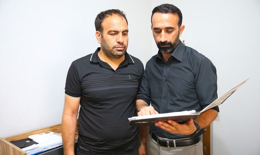Diyarbakır'da 13 katlı apartmanda çıkan yangında eşi ve 3 çocuğunu kaybeden Süleyman Çavdar (solda) ile avukatı Faysal Okumuş (sağda), AA muhabirine açıklamada bulundu.