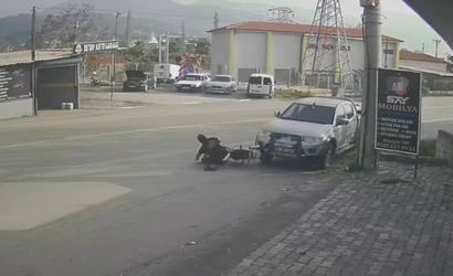 Çarpışmanın şiddetiyle motosiklet sürücüsü metrelerce savrularak havaya uçtu. Kaza anı, bölgedeki bir güvenlik kamerası tarafından anbean kaydedildi.