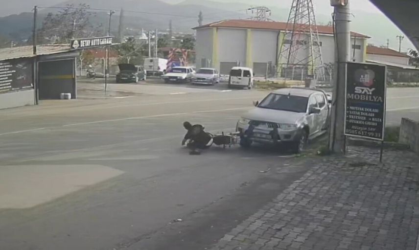 HATAY'DA GÜVENLİK KAMERASINA YANSIYAN KAZADA CİPLE ÇARPIŞAN MOTOSİKLETİN SÜRÜCÜSÜ METRELERCE SAVRULDU.