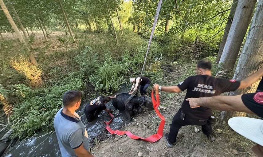 Düzce'de bataklığa saplanan inek itfaiye ekiplerinin yardımıyla kurtarıldı. Ekipler, bir süre dinlenmesini bekledikleri ineği daha sonra sahibine teslim etti.