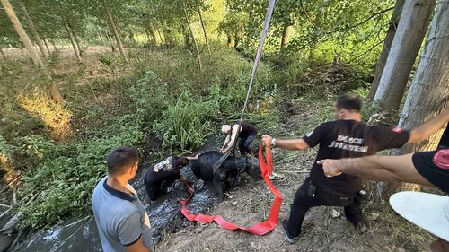 Düzce'de bataklığa saplanan inek, itfaiye ekiplerinin 1 saatlik çabasıyla kurtarıldı ve sahibine teslim edildi.