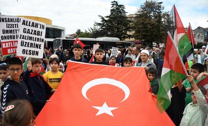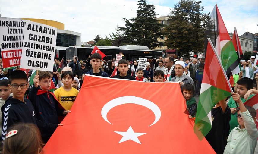 Düzce'de, Gazze'ye insani yardım ulaştırmak için yola çıkan ve İsrail'in saldırısına uğrayan Küresel Sumud Filosu'na destek için yürüyüş yapıldı.