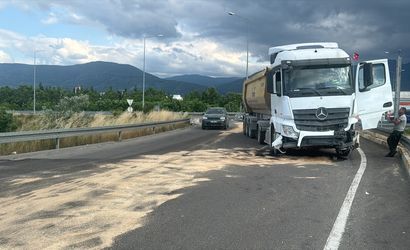 Düzce'de bariyer ve beton bloklara çarpan tırın sürücüsü kazayı yara almadan atlattı.