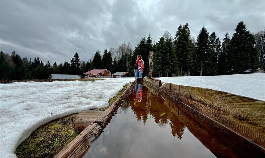 Düzce'deki yaylaları ziyaret edenler, kıştan kalan kar örtüsünün ve ilkbahar mevsiminde açan çiçeklerin oluşturduğu muhteşem manzarada vakit geçiriyor.