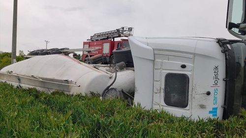 Edirne'nin Lalapaşa ilçesinde devrilen beton mikserinin sürücüsü A.E. yaralandı, sağlık ekipleri olay yerine intikal etti.