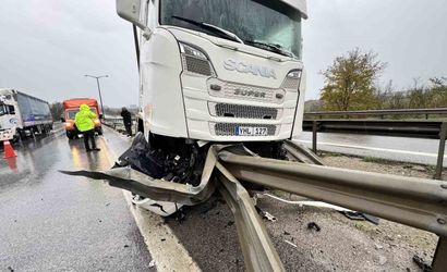 Edirne'de E-80 Avrupa Otoyolu üzerinde seyreden YHL 127 plakalı tır, şiddetli sağanak nedeniyle bariyerlere saplandı. Kazada sürücü E.Y. yara almadan kurtuldu.