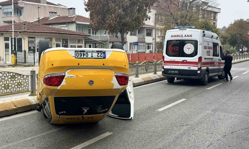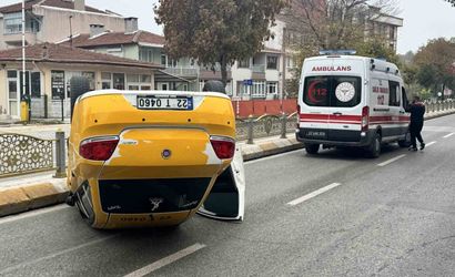 Edirne'nin Atatürk Bulvarında, 22 T 0460 plakalı ticari taksiyle seyreden sürücü Vezattin Başkurt, önüne çıkan araca çarpmamak için manevra yaptığı sırada orta refüje çarptı ve otomobil ters devrildi.