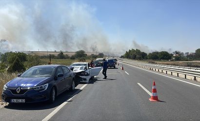 Edirne'de geniş bir alanda etkili olan anız yangınını söndürme çalışmaları devam ediyor. D-100 kara yolu Edirne- Havsa istikametinde yoğunlaşan duman nedeniyle 5 aracın karıştığı zincirleme trafik kazası meydana geldi.