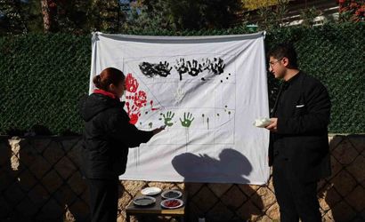Etkinlikte öğrenciler, kırmızı, siyah ve yeşile boyadıkları parmaklarını ve ellerini kumaştan oluşturulan panoya basarak Filistin bayrağını simgeleyen bir çalışma ortaya çıkardı.
