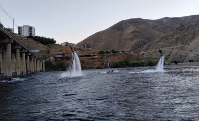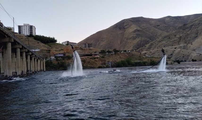 Elazığ'ın Keban ilçesinde düzenlenen "5. Keban Su ve Balık Festivali" ikinci gün etkinlikleriyle devam etti. Festival kapsamında Keban Baraj Gölü ile Fırat Nehri'nde flyboard gösterisi yapıldı.