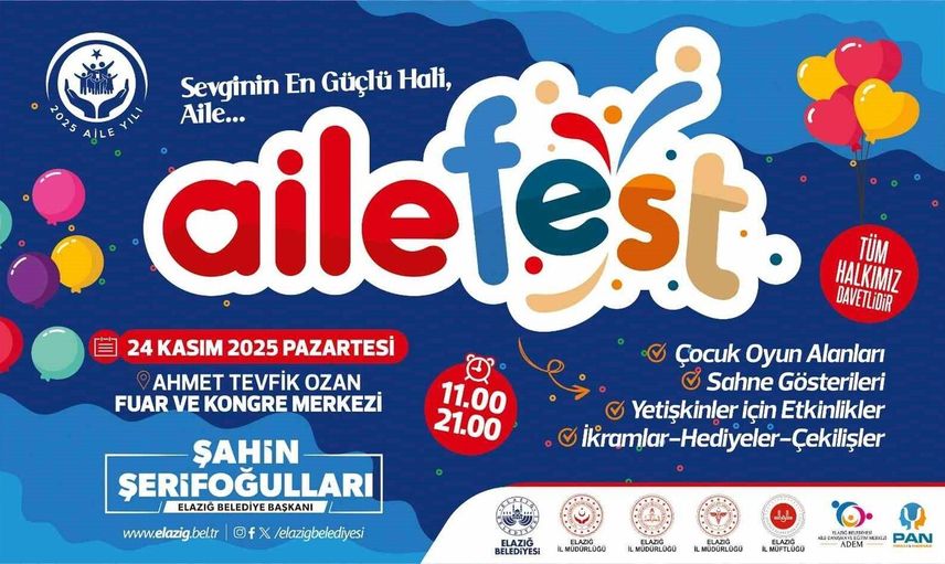 Elazığ Belediyesi açıklamasına göre AileFest, 24 Kasım Pazartesi günü 11.00 - 21.00 saatleri arasında düzenlenecek. Belediye, şehirde birlik ve dayanışma ruhunu güçlendirecek bu buluşmaya tüm hemşerilerini davet ediyor.