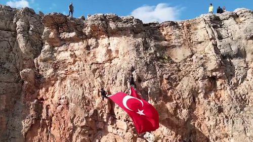 Elazığ'ın Ağın ilçesinde 29 Ekim'de 7 profesyonel dağcı, 50 metrelik Balkayası'na 4x6 metre Türk bayrağıyla tırmandı; etkinlik dronla görüntülendi.