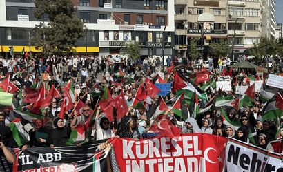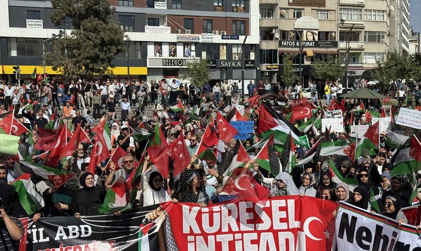 El-Aksa Platformu ve bazı sivil toplum kuruluşlarının öncülüğünde İzzet Paşa Camisi önünde toplanan kalabalık, taşıdıkları Filistin bayrakları ve pankartlarla Gazi Caddesi'nden Cumhuriyet Meydanı'na kadar yürüdü.