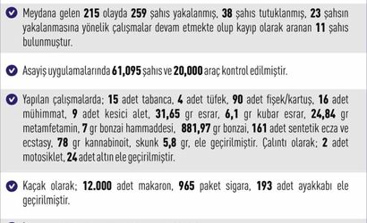 Kent genelinde meydana gelen 215 asayiş olayı kapsamında 259 şüpheli yakalandı; bu kişilerden 38'i tutuklandı.