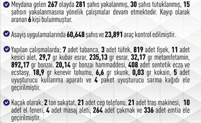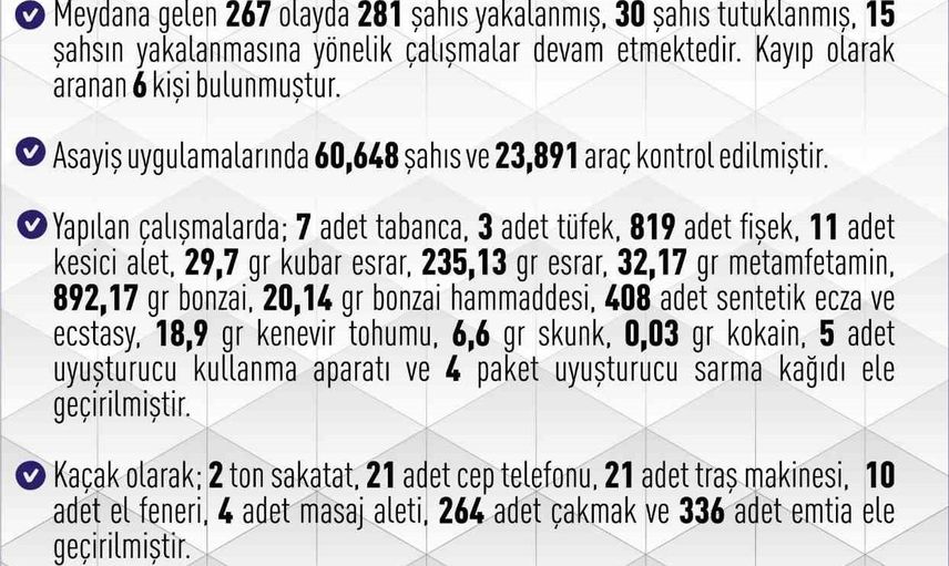 Çalışmalarda ele geçirilenler arasında 7 adet tabanca, 3 adet tüfek, 819 adet fişek, 11 adet kesici alet, 29,7 gram kubar esrar, 235,13 gram esrar, 32,17 gram metamfetamin, 892,17 gram bonzai, 20,14 gram bonzai hammaddesi, 408 adet sentetik ecza ve ecstasy, 18,9 gram kenevir tohumu, 6,6 gram skunk, 0,03 gram kokain, 5 adet uyuşturucu kullanma aparatı ve 4 paket uyuşturucu sarma kağıdı bulunuyor.