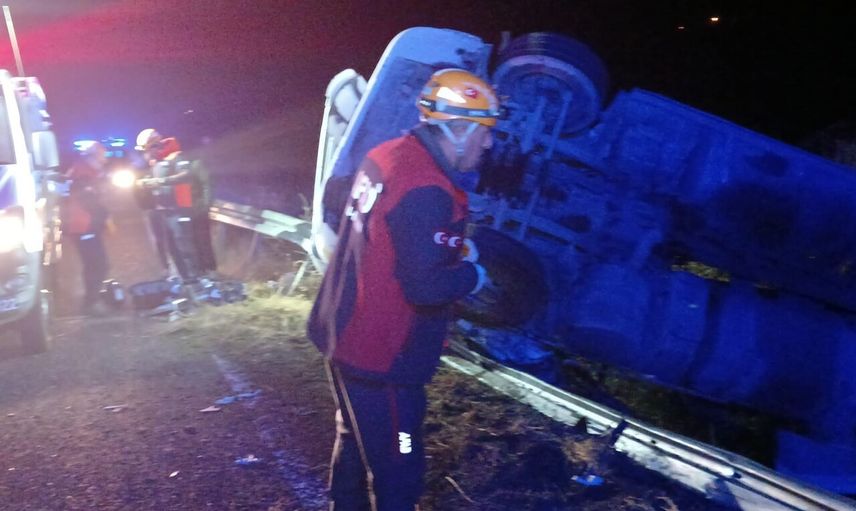 Elazığ'ın Sivrice ilçesi Gözeli yol ayrımı mevkisinde, 23 AB 081 plakalı kamyon sürücüsünün direksiyon hakimiyetini kaybetmesi sonucu bariyerlere çarparak devrildi.