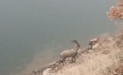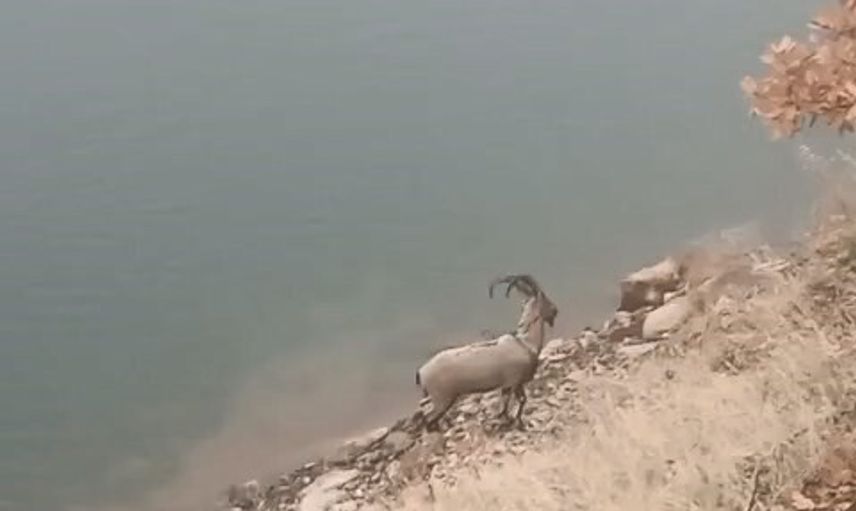 Elazığ'ın Karakoçan ilçesinde, sarp kayalıklara tırmanma ve tutunma özellikleriyle bilinen koruma altındaki dağ keçisi, bu kez Özlüce Baraj Gölü'nde yüzerken görüldü.