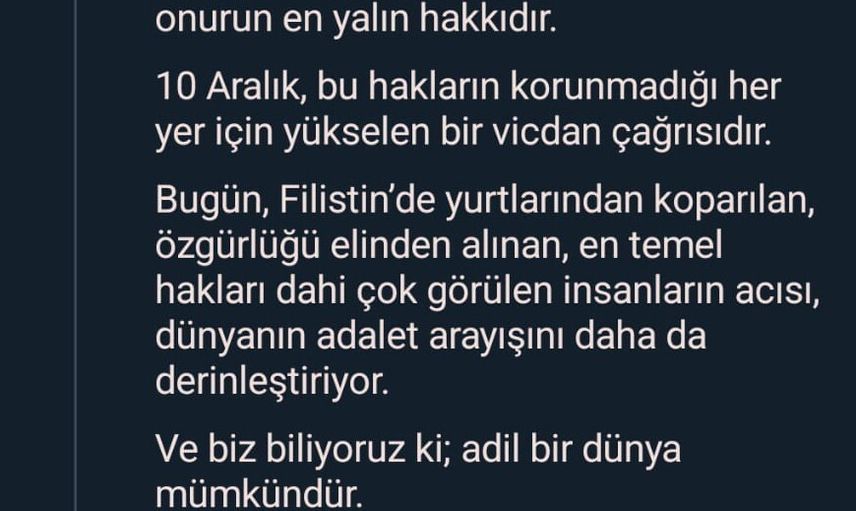"İnsan hakları, insanın doğuştan taşıdığı onurun en yalın hakkıdır. 10 Aralık, bu hakların korunmadığı her yer için yükselen bir vicdan çağrısıdır. Bugün Filistin’de yurtlarından koparılan, özgürlüğü elinden alınan, en temel hakları dahi çok görülen insanların acısı, dünyanın adalet arayışını daha da derinleştiriyor. Ve biz biliyoruz ki adil bir dünya mümkündür. Yeter ki insan, insanın acısına duyarsız kalmasın, yeter ki hak, güçten değil, haktan yana büyüsün."