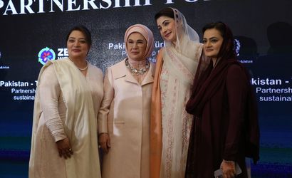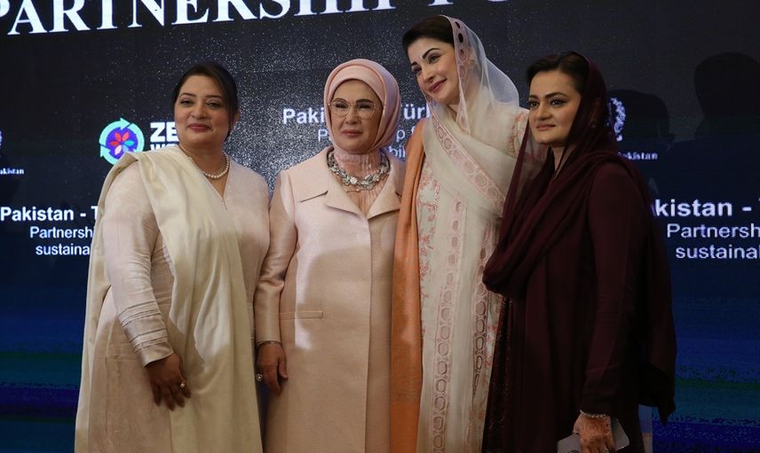 Resmi temaslarda bulunmak üzere Pakistan'ın başkenti İslamabad'a gelen Cumhurbaşkanı Recep Tayyip Erdoğan'a eşlik eden eşi Emine Erdoğan (sol 2), Eski Pakistan Başbakanı Navaz Şerif'in kızı ve Pencap Eyaleti Başbakanı Meryem Navaz Şerif'in (sağ 2) ev sahipliğinde düzenlenen "Döngüsel Ekonominin İlerletilmesi: Sürdürülebilirlik İçin Pakistan-Türkiye Ortaklığı” programına katıldı.