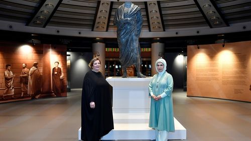 Emine Erdoğan, Gürcistan Cumhurbaşkanı eşi Tamar Bagrationi ile Cumhurbaşkanlığı Millet Kütüphanesi'ni ziyaret etti; Mesnevi hediye edildi ve Marcus Aurelius heykelinin iadesi konuşuldu.